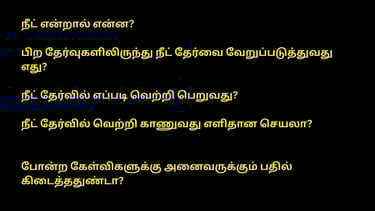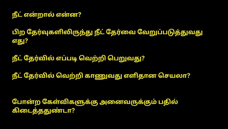 நீட் தேர்வை பற்றி தெளிவான விவரங்களை கூறும் இக்கட்டுரை பெரிதாக இருக்கும். உங்களது பொன்னான ரேத்தில் சில நிமிடங்களை இக்கட்டுரையை படிக்க செலுத்துமாறு கேட்டுக்கொள்கிறோம்.